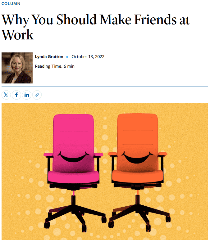 Lynda Gratton, a Professor of Management Practice at London Business School, has researched the impact of workplace friendships, highlighting that having a close friend or “trusted confidant” at work is a significant driver of employee engagement, personal resilience, and happiness.